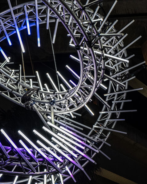 Made of over 160 precisely arranged LED tubes that pulse with programmed light sequences, creating moments of both subtle glimmer and dynamic bursts. These shifting illuminations echo the fragmented yet profound nature of dreams - fleeting but resonant. The three rings not only reflect separate facets of time but also how memory, perception, and hope intertwine in our subconscious to shape imagination and identity.