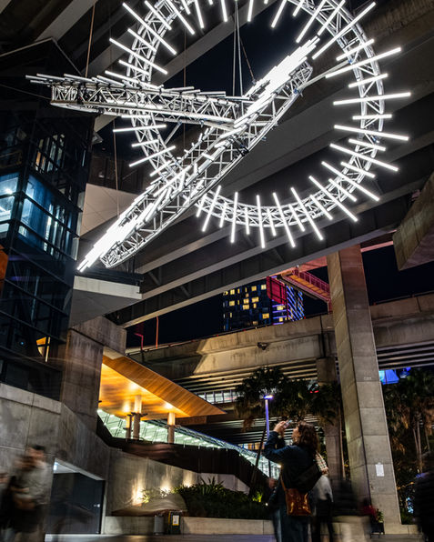 Entwine is a suspended light installation composed of three interlinked circular forms, designed to evoke the ephemeral and emotional qualities of dreaming. Positioned overhead, the rings glow with shifting colours and patterns, drawing inspiration from the convergence of the past, present, and future - a central theme of Vivid Sydney 2025, where the work made its debut.