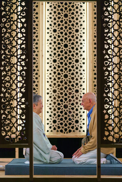 Using light and shadow, the pavilions transform their surroundings into rooms that emulate Islamic sacred spaces, dense with geometric ornamentation and pattern referencing such precedent as traditional Arabic mashrabiyas. Repeated over and over again, seemingly exponentially, these geometric patterns inspire a sense a cosmic harmony. As the day fades to a darker night, the perforated walls generate an imposing yet rhythmic atmosphere, subtle LED lighting creates a space of illumination, where patterns of light filter through filigreed screens.